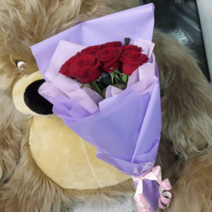 Rosas y un osito de peluche con bombones de chocolate