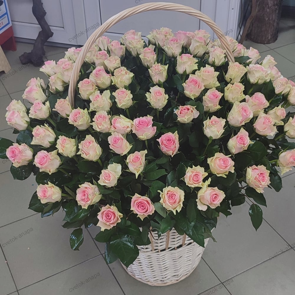 101 rosas en una cesta de mimbre
