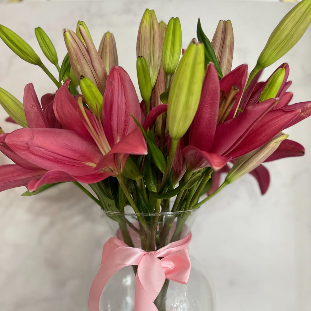 Jarron con variedad de lilys, decorado con liston y tarjeta personalizada.