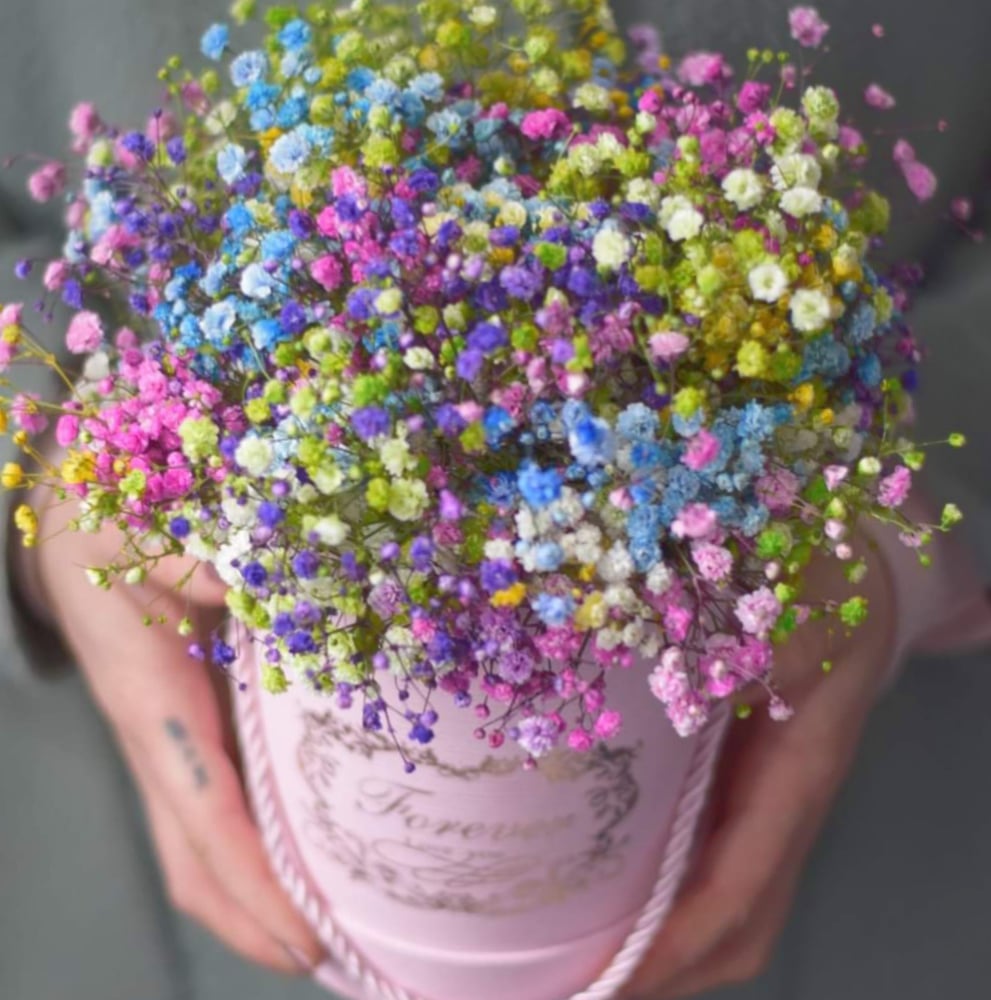 Una nube de gypsophila arcoíris en una caja de sombreros es un lindo cumplido para una niña, hermana o hija amada.