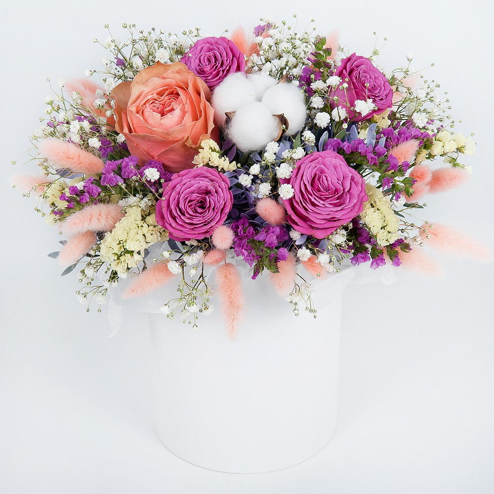 "Armonía Floral" es una exquisita composición de gypsophila, rosa parecida a la peonía Kahala, rosa de arbusto, statice, pistacho y algodón en una elegante caja de sombrero. Flores secas surtidas añaden encanto y originalidad al ramo. El oasis asegura la frescura duradera de las flores, mientras que el capullo de algodón crea una sensación de ternura y ligereza. ¡El regalo perfecto para seres queridos y cercanos!
