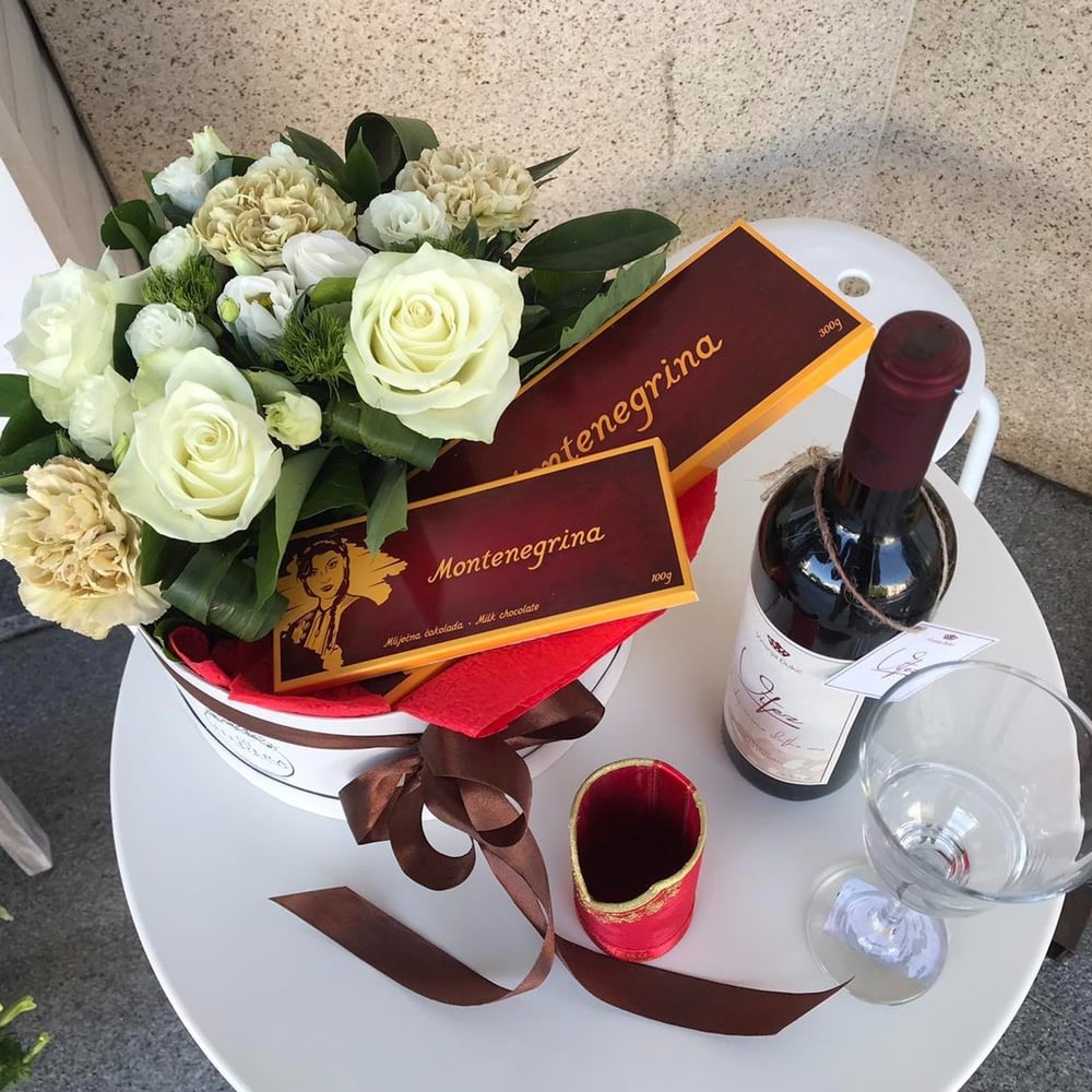 Delight your loved ones with an exquisite composition with wine and chocolate.