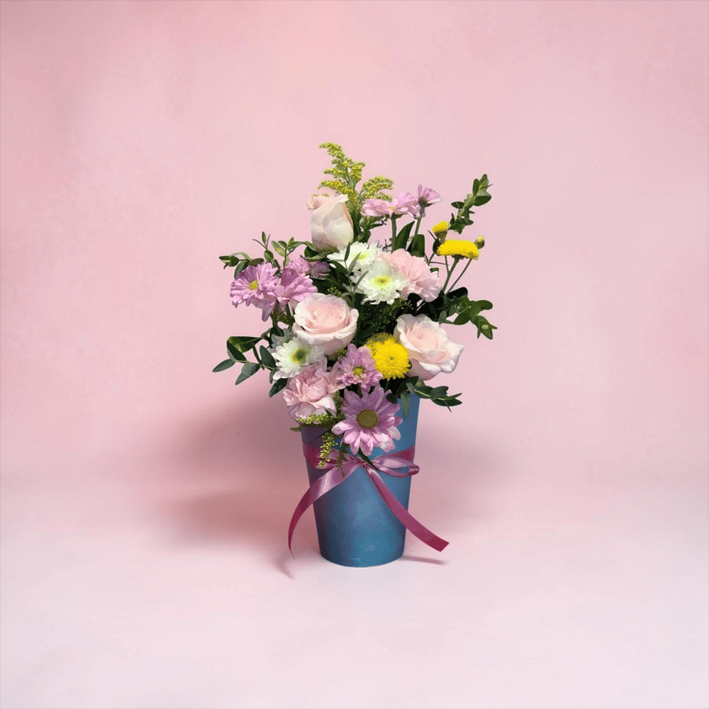 Bello arreglo floral, para hacer feliz el corazón de mamá. Hecha con 3 rosas caricia, 2 claveles rosas, 3 varas de margarita lila y 2 de velo de novia, 2 bolis amarillas, 3 varas de solidago y finos…