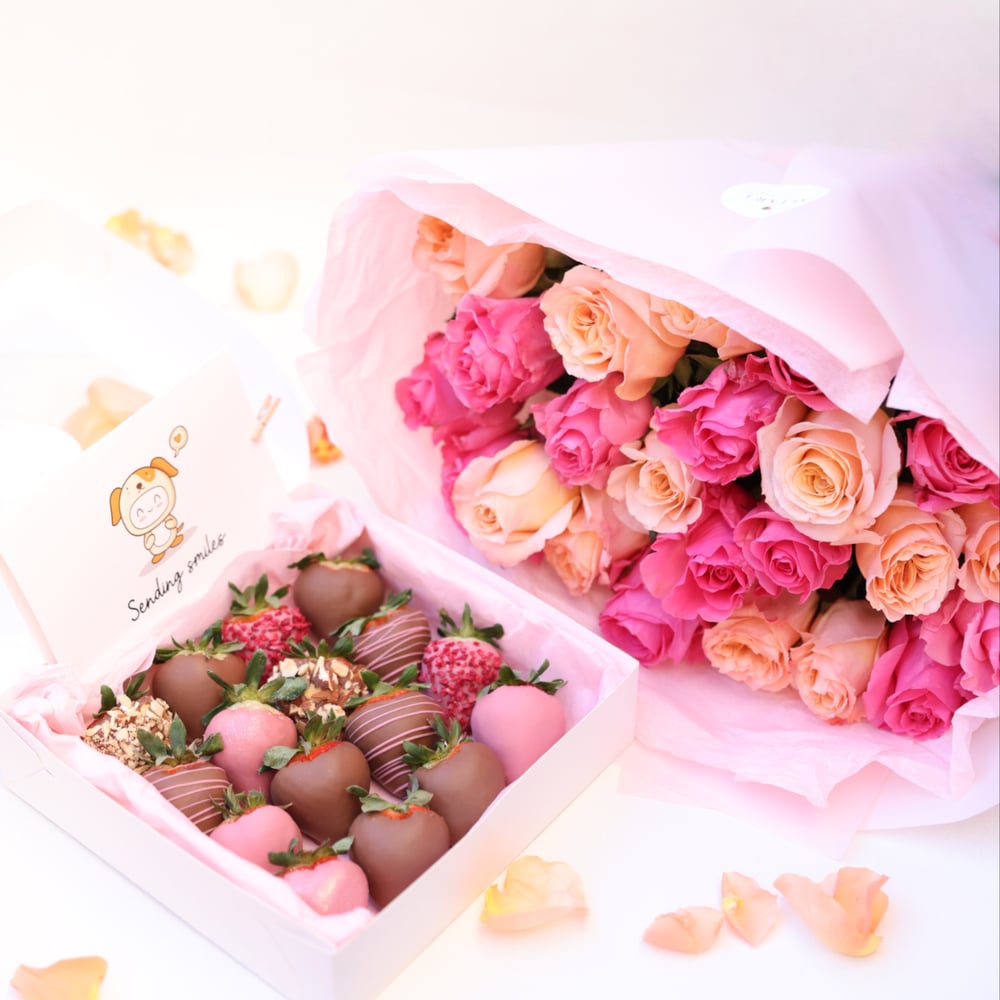¡El complemento dulce perfecto para tus seres queridos! Chocolate belga natural, fresas maduras y un lindo ramo de hermosas rosas. ¡Combinación perfecta para complacer y sorprender a todos lo...