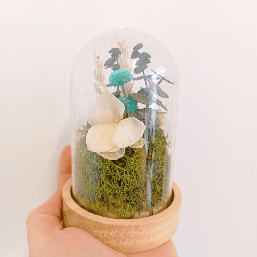 Cúpula de flores preservadas en verde, turquesa y beige con musgo preservado