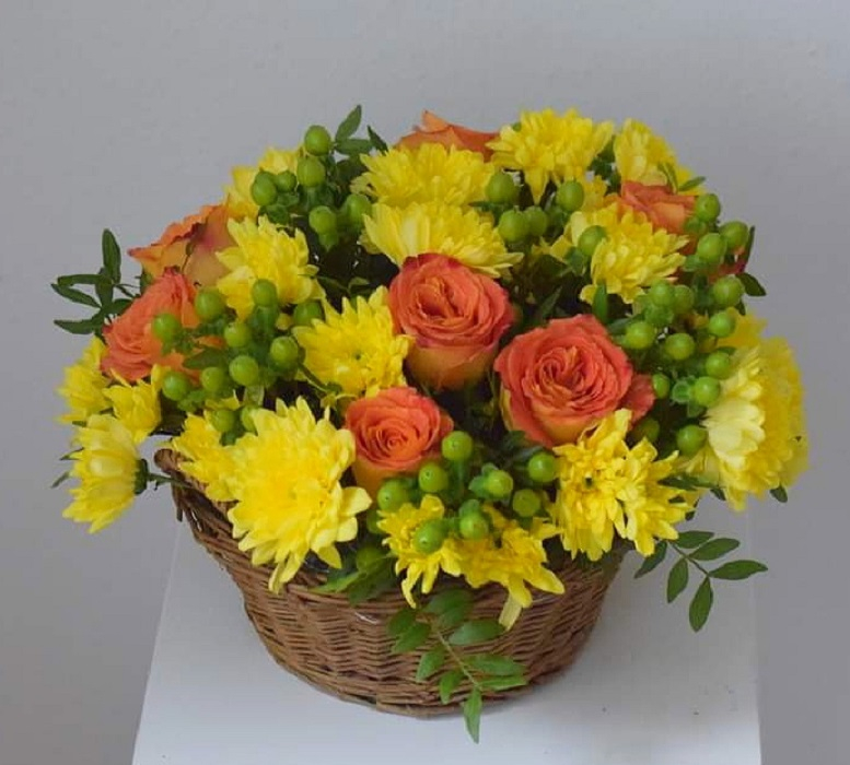 ¡Un ramo brillante y soleado de crisantemos y rosas, envejecido en una paleta de color amarillo anaranjado, está garantizado para deleitar a un ser querido y darle una carga de energía positiva duran…