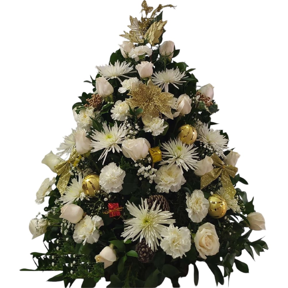 Arreglo floral con 24 rosas blancas, pompones y apliques navideños variados