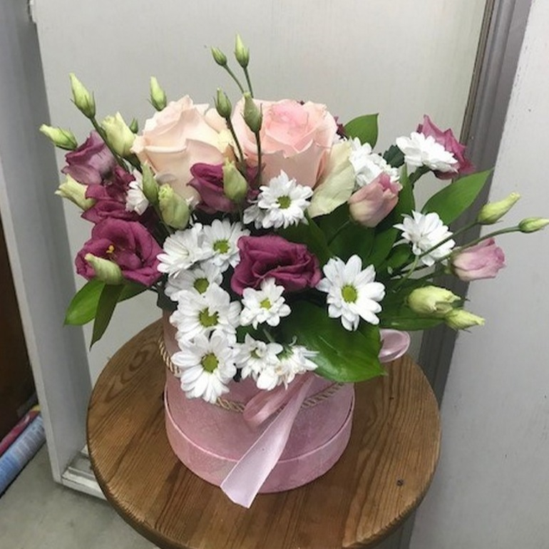 Una linda composición de tonos rosas en una caja de sombrero es el regalo perfecto para cualquier ocasión.