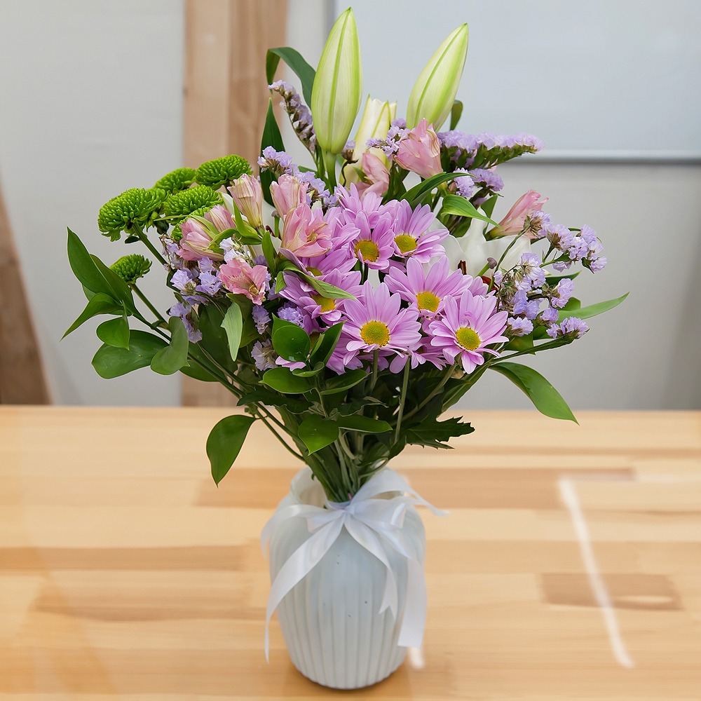 Inspirado en la diosa griega de la naturaleza salvaje, nuestro ramo "Encanto de Artemisa" es una mezcla armoniosa de belleza del bosque y elegancia divina. Los crisantemos verdes y los lirios significan abundancia y pureza, mientras que las alstroemerias y el statice añaden un toque de misterio. Finalizado con ruscus y atado con un lazo, este ramo es una ofrenda divina desde el corazón de la naturaleza.
