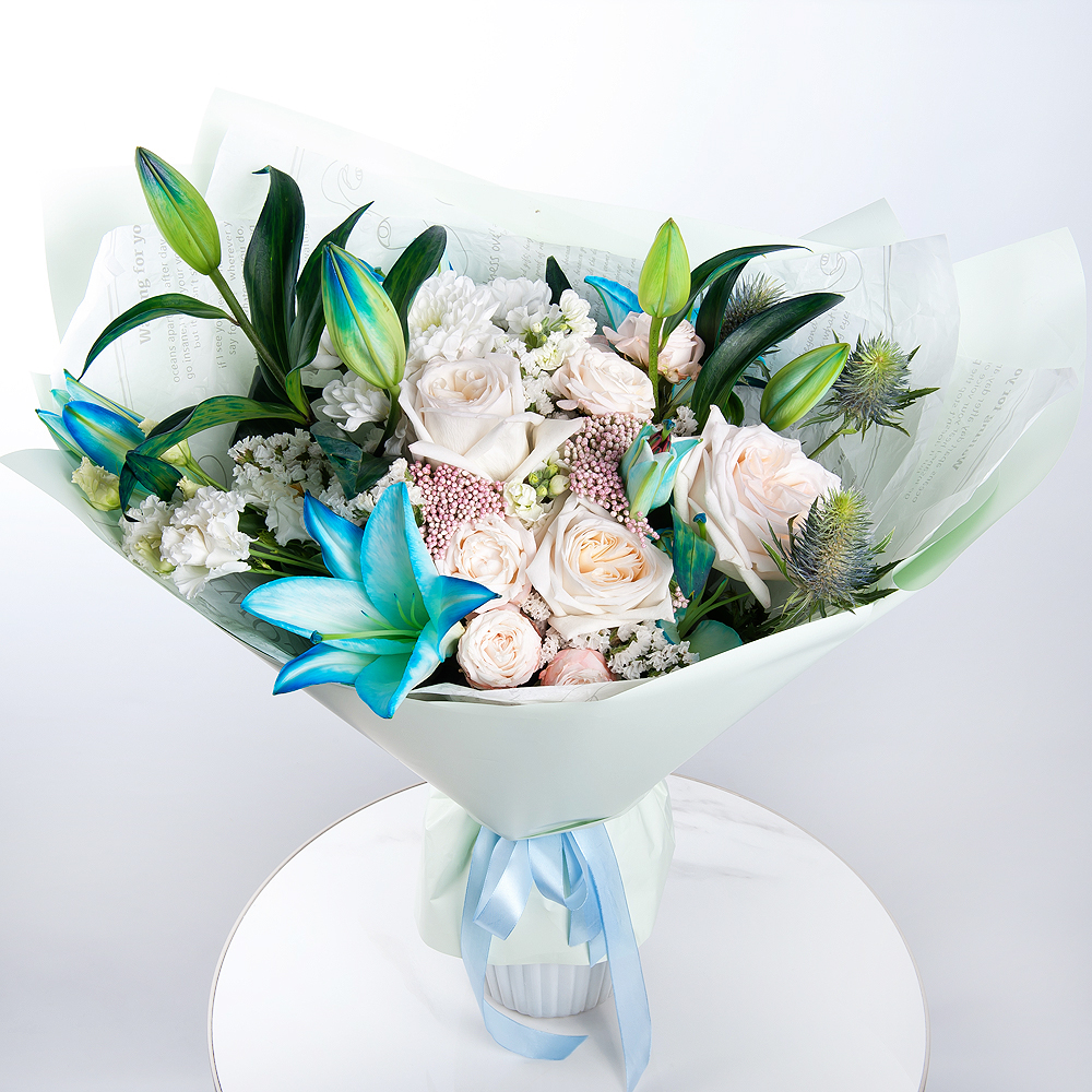 El ramo "Éxtasis Azur" es una verdadera obra de arte, creada con las flores más exquisitas. El ramo combina armoniosamente lirios, matthiolas, crisantemos de arbusto y rosas peonía, que le otorgan ternura y elegancia. Los lisianthus, ozotamnus, eryngium y statice añaden ligereza y aire a la composición, mientras que las rosas peonía "OHara" se convierten en un brillante acento que resalta la belleza y sofisticación del ramo. El ramo "Éxtasis Azur" será un regalo maravilloso para cualquier ocasión. Es adecuado para felicitar en un cumpleaños, aniversario, boda o cualquier otra celebración. ¡Ordene el ramo "Éxtasis Azur" y regale a usted mismo o a sus seres queridos emociones inolvidables!