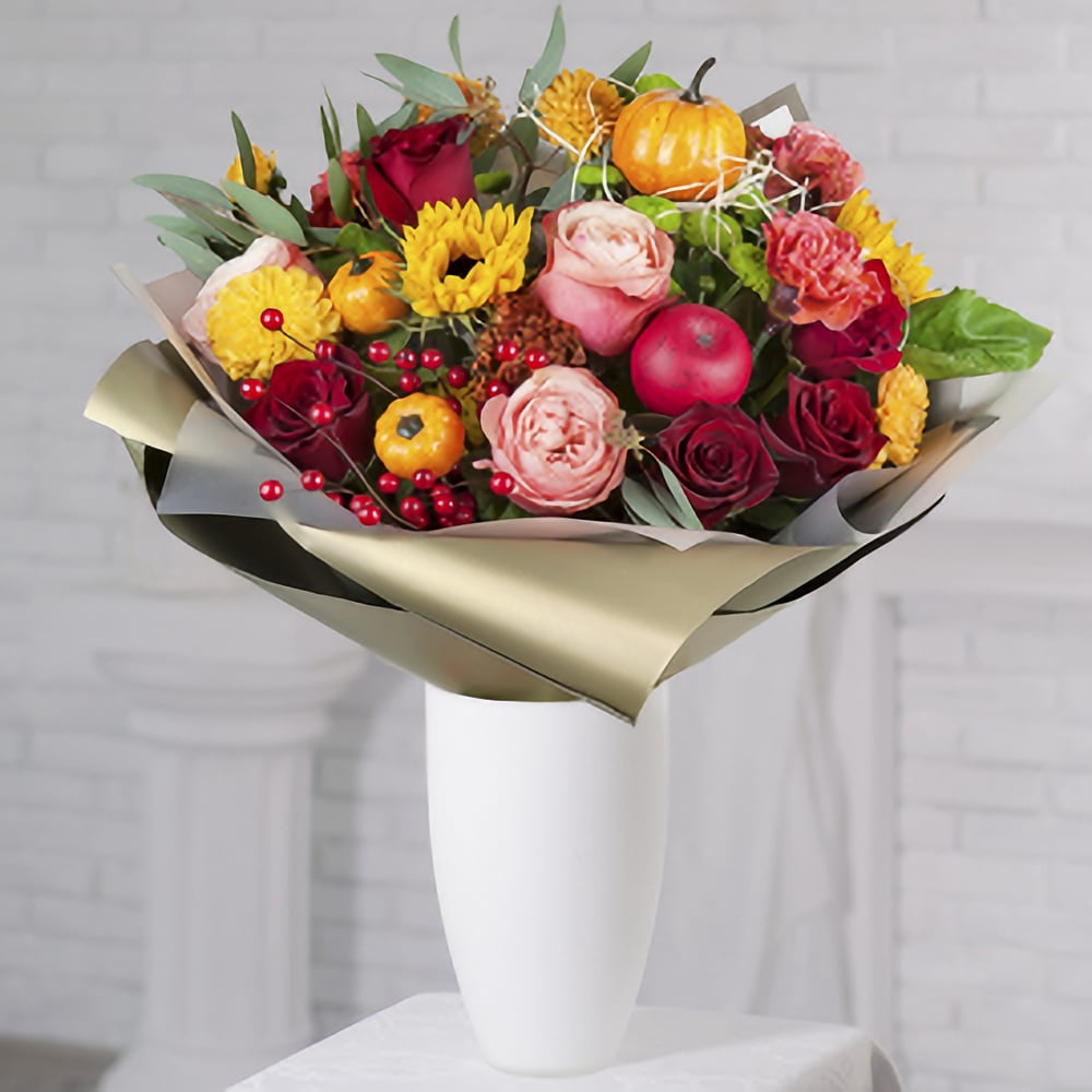Samhain es un antiguo festival gaélico del final de las temporadas de cosecha. Inspirados en la belleza de la celebración tradicional, hemos creado este magnífico arreglo lleno de colores otoñales, flores de temporada y manzanas maduras.