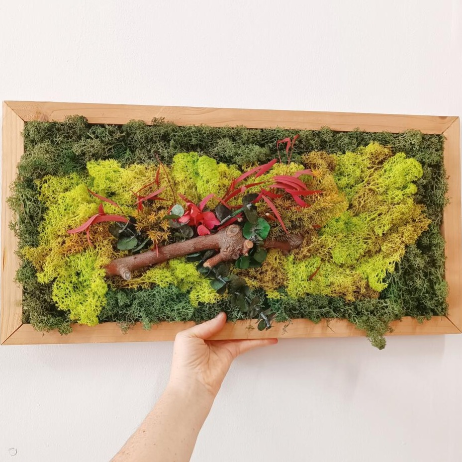 Nuestros jardines verticales no necesitan cuidados Los marcos están hechos a mano en nuestro taller de forma artesanal con madera natural. Tienen una textura esponjosa gracias al musgo y el liquen y un olor a madera y eucalipto súper agradable. Las plantas y flores provienen de viveros locales y son preservadas, pasan por un proceso en el que se extrae su savia y se sustituye por un líquido preservante que hace que duren años así de bonitas como si estuvieran aletargadas. En cada uno ponemos plantas de distintas especies escogidas para que queden armónicos imitando el camino natural que seguiría la vegetación. Todo esto hace que cada jardín sea único 💚