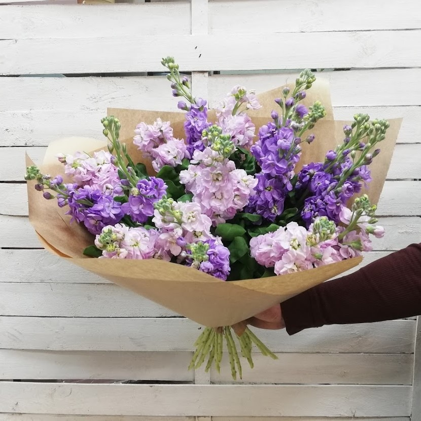 El amor lavanda es una mezcla de matthiola en diferentes tonos de púrpura. Es difícil no estar de acuerdo en que este ramo es amor verdadero.