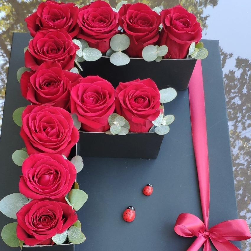 Puede elegir la primera letra del nombre del destinatario u ordenar el nombre completo del destinatario, para esto necesita seleccionar el producto tantas veces como las letras en el nombre del destinatario. Además, puede especificar el color deseado de las rosas y el color de la caja.