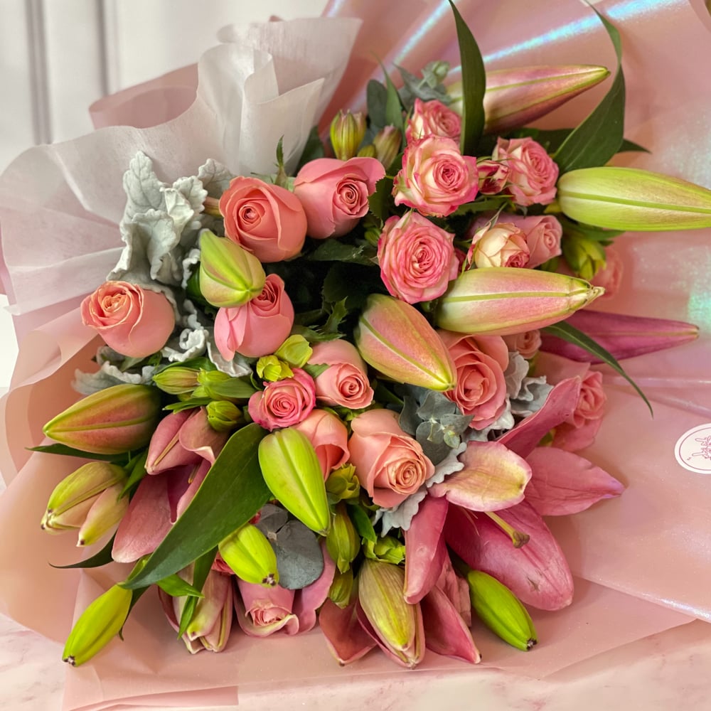 Ramo con variedad de flores como lilys, altromelias, rosas, dolar, solidago, decorado con papel especial, liston satinado y tarjeta personalizada.