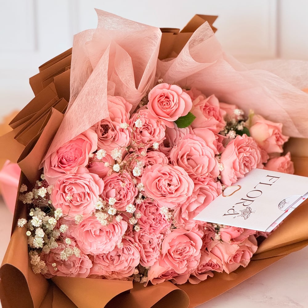Ramo de 50 mini rosas del color en existencia, con papel especial, liston satinado y tarjeta perzonalizada.
