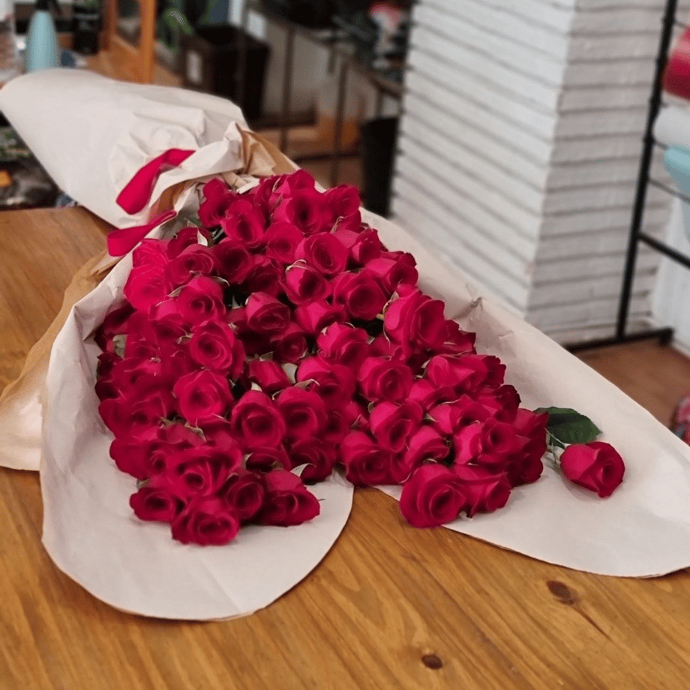 Ramo elegante compuesto por rosas rojas frescas premium cuidadosamente seleccionadas y envueltas en papel decorativo. Diseño clásico y romántico ideal para expresar amor, pasión o felicitaciones en c…