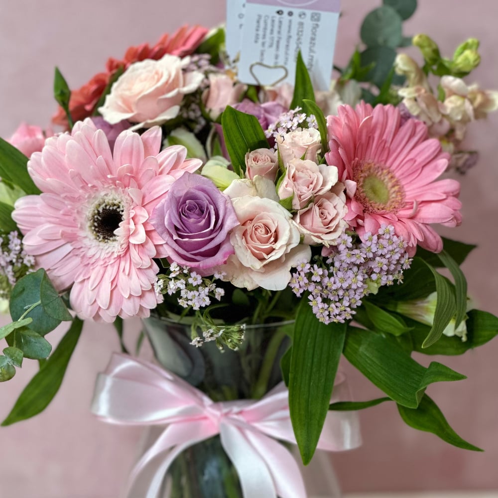 Jarron con variedad de rosas, margaritas, follajes de temporada, gerberas, decorado con tarjeta perzonalizada y liston satinado.