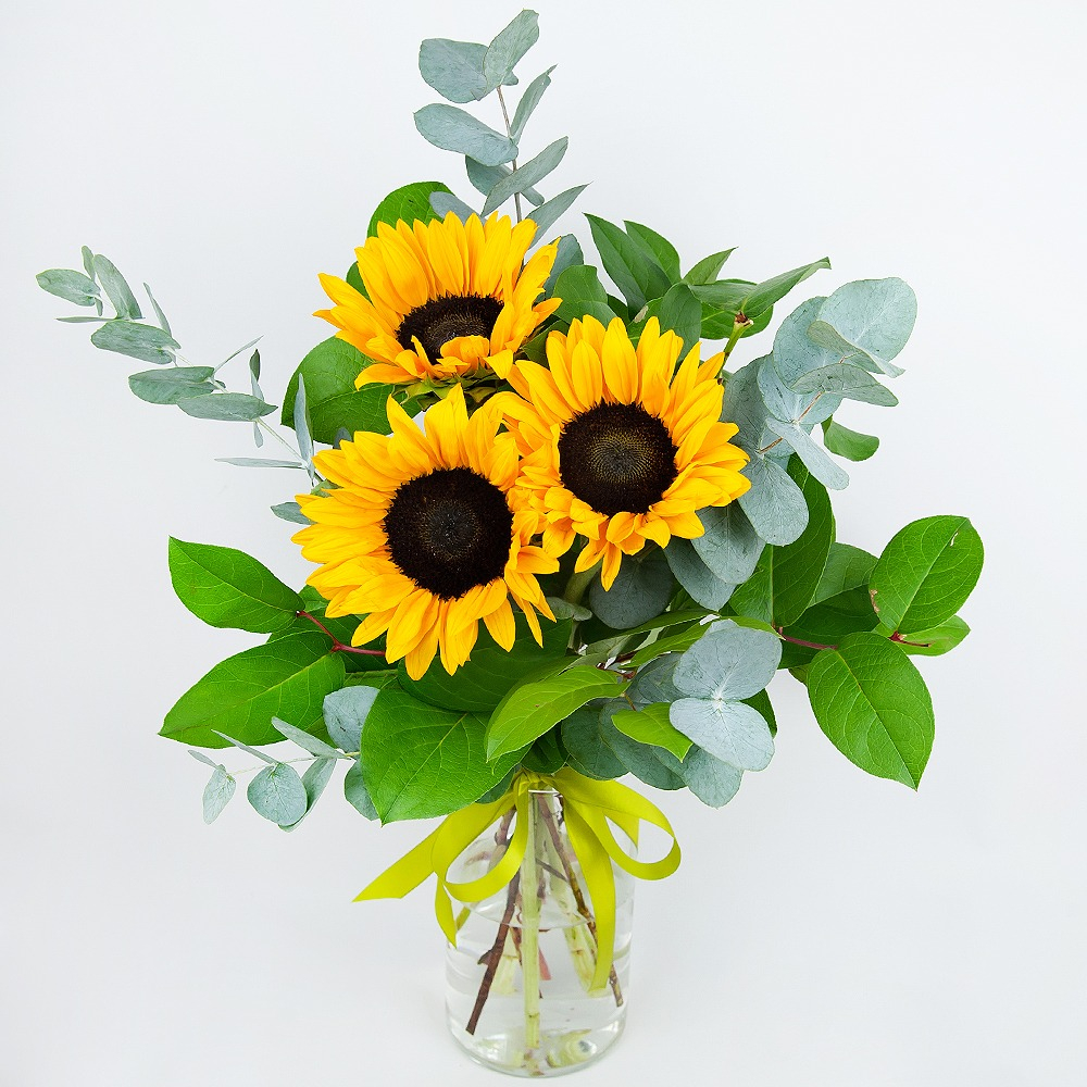 Un positivo y soleado ramo de brillantes girasoles, statice y refrescantes hojas de eucalipto es exactamente lo que quieres dar para llenar el corazón del destinatario con alegría y la anticipación...