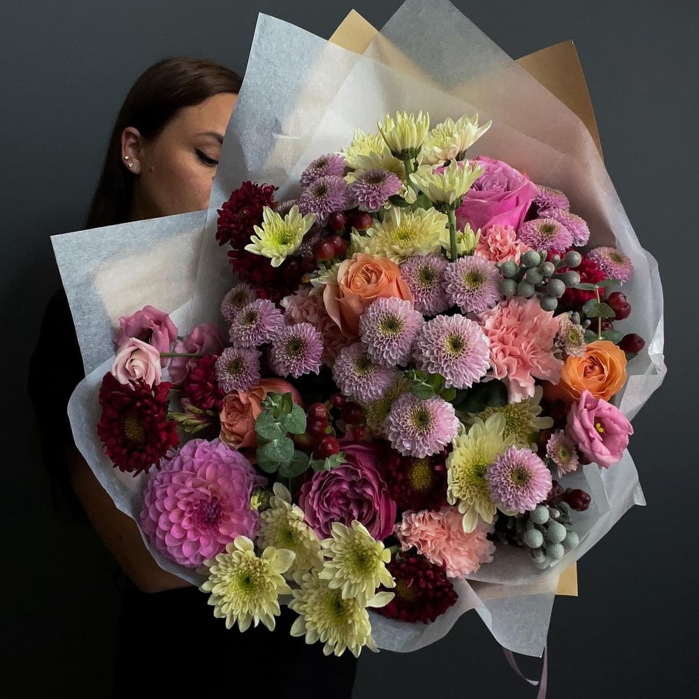 El ramo presenta dalias, rosas, claveles, crisantemos, follaje y eucalipto. El tamaño es Mediano. La altura es de 50 cm. Nota: Trabajamos con flores frescas de temporada, por lo que la composición del ramo puede variar un poco. Incluso en ausencia de una flor de temporada, tratamos de reunir un ramo lo más parecido posible. Si una flor en particular es importante para usted, por favor contáctenos con la nota y acordaremos las opciones con usted.
