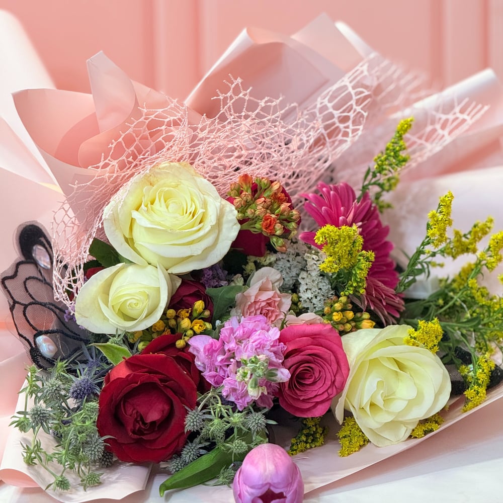 Ramo con variedad de flores como rosas, gerberas, perrito, decorado con papel especial, listón y tarjeta personalizada.