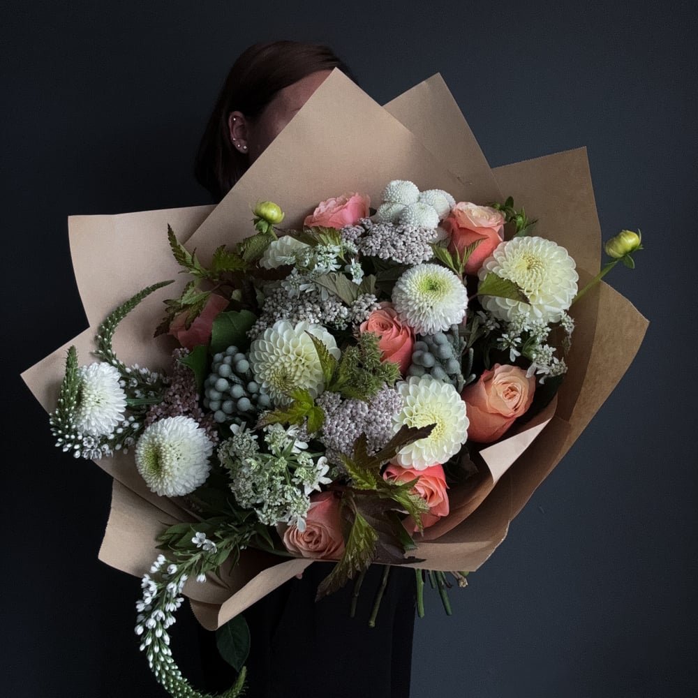 El ramo presenta dalias, rosas, claveles, follaje, eucalipto. El tamaño es mediano. La altura es de 50 cm. Nota: Trabajamos con flores frescas de temporada, por lo que la composición del ramo puede variar un poco. Incluso en ausencia de una flor de temporada, tratamos de armar un ramo lo más similar posible. Si una flor en particular es importante para usted, por favor, contáctenos con la nota y acordaremos las opciones con usted.