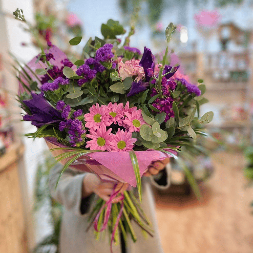 Ramo fresco y vibrante compuesto por crisantemos rosados, statice violeta, clavel bicolor, iris morado y eucalipto, acompañado de verdes decorativos. Un diseño alegre y primaveral ideal para sorprend…