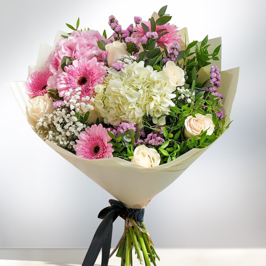 Producto incluye: 1 hortensia rosa y 1 blanca 4 gerberas rosas con follaje como relleno 5 rosas blancas