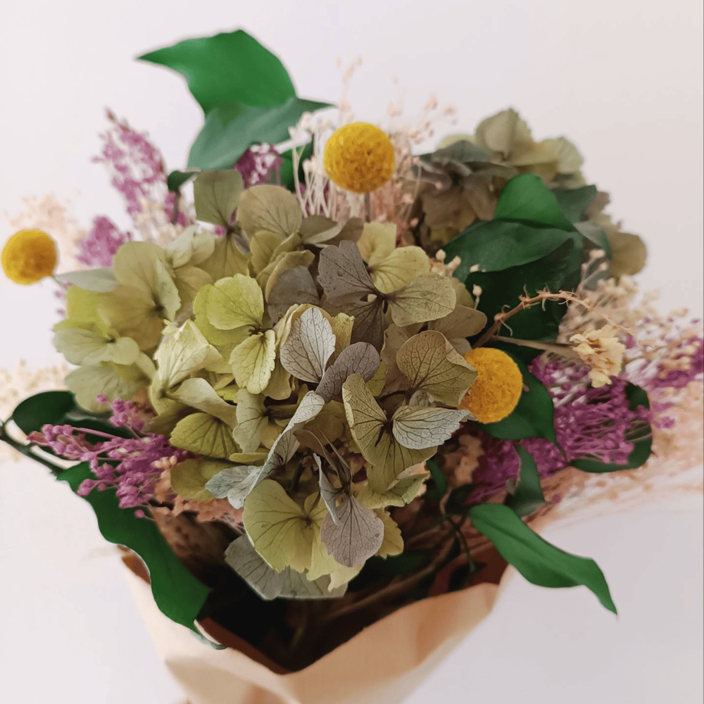 Ramo de flores preservadas verde y morado con hortensia,eucalipto,craspedia,bloom...