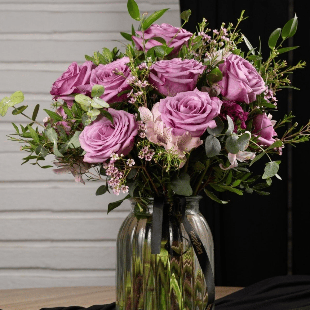 Composición sofisticada con rosas en tono lila/lavanda acompañadas de alstroemeria suave, waxflower y eucalipto. Diseño equilibrado, femenino y moderno que transmite elegancia, serenidad y romanticismo. Ideal para regalo especial o decoración refinada.