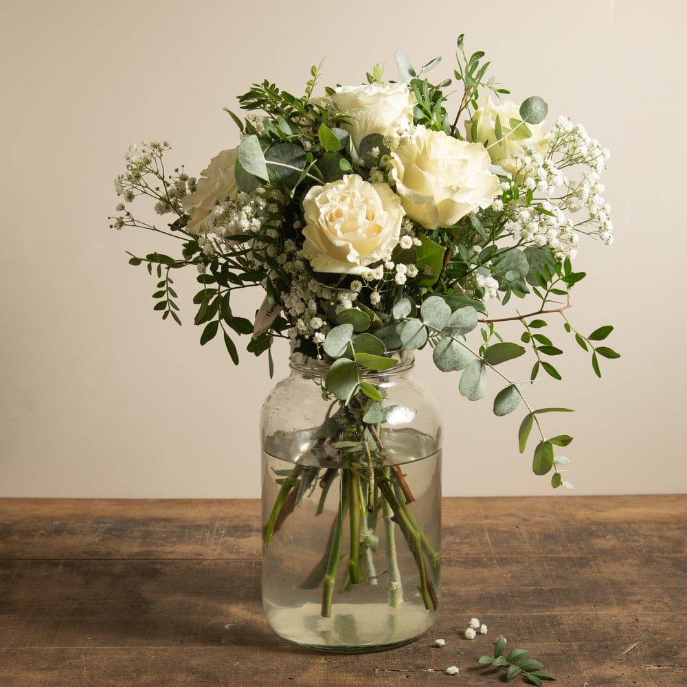 Precioso ramo con 6 rosas blancas y verdes variados.