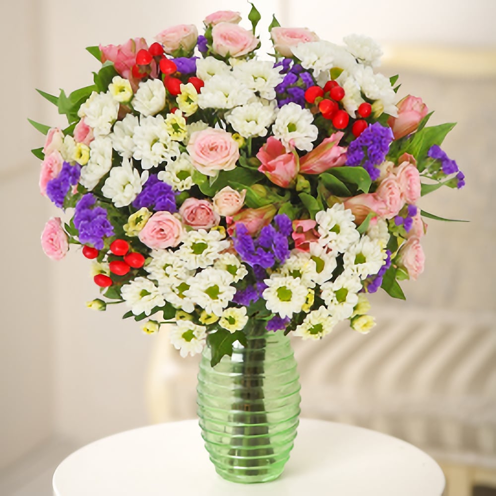 Un ramo para los niños, compuesta de pequeños ramilletes de rosas de color rosa suave, alstromeria oro, margaritas blancas y frutos rojos - que será una suave y tocar presente para su hijo. flores brillantes y vivos van a añadir notas suaves a la celebración. Este brillante, colorido, ramo suave se mantiene en la memoria por mucho tiempo.