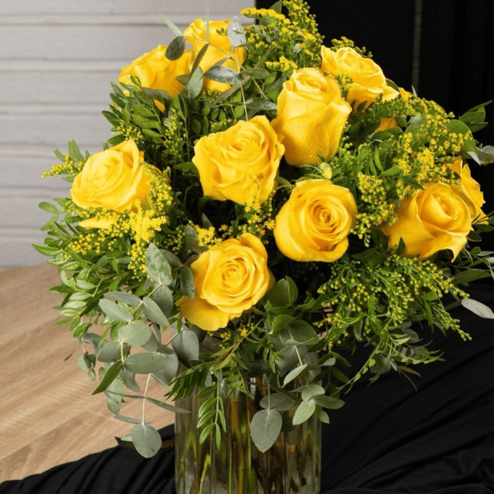 Composición floral elegante y luminosa con rosas amarillas acompañadas de follaje verde y pequeñas flores decorativas. Diseño fresco y alegre que transmite energía positiva, amistad y felicidad.