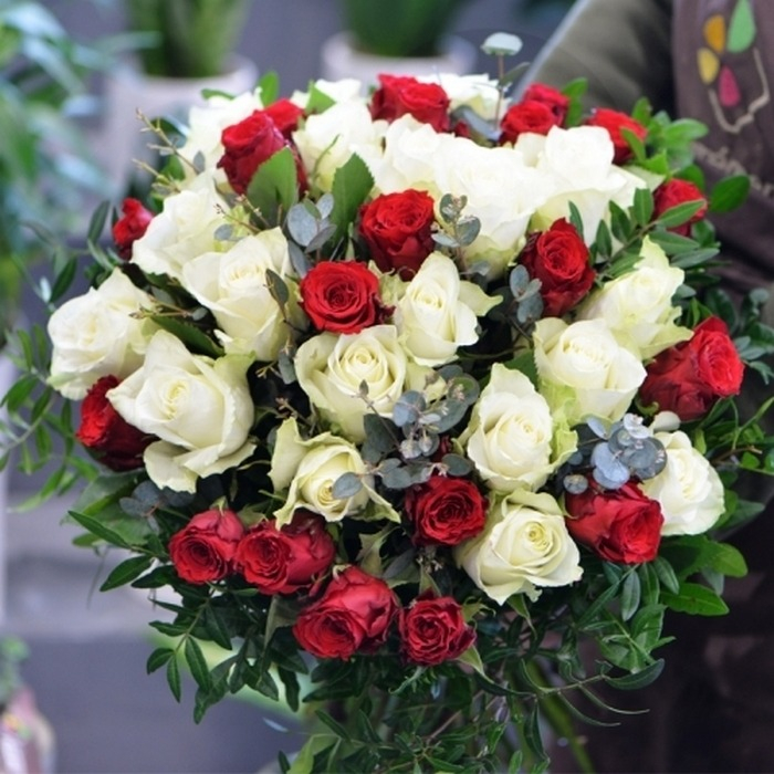 Este ramo de rosas está elaborado con rosas rojas y blancas de variedades seleccionadas cuidadosamente por nuestros floristas, acompañado de un follaje variado. Las rosas rojas y blancas expresan p...