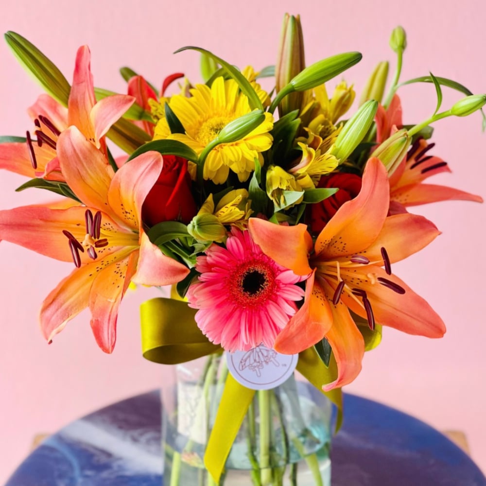 Jarron con variedad de gerberas, rosas, altromelias, lilys, decorado con liston y tarjeta personalizada.