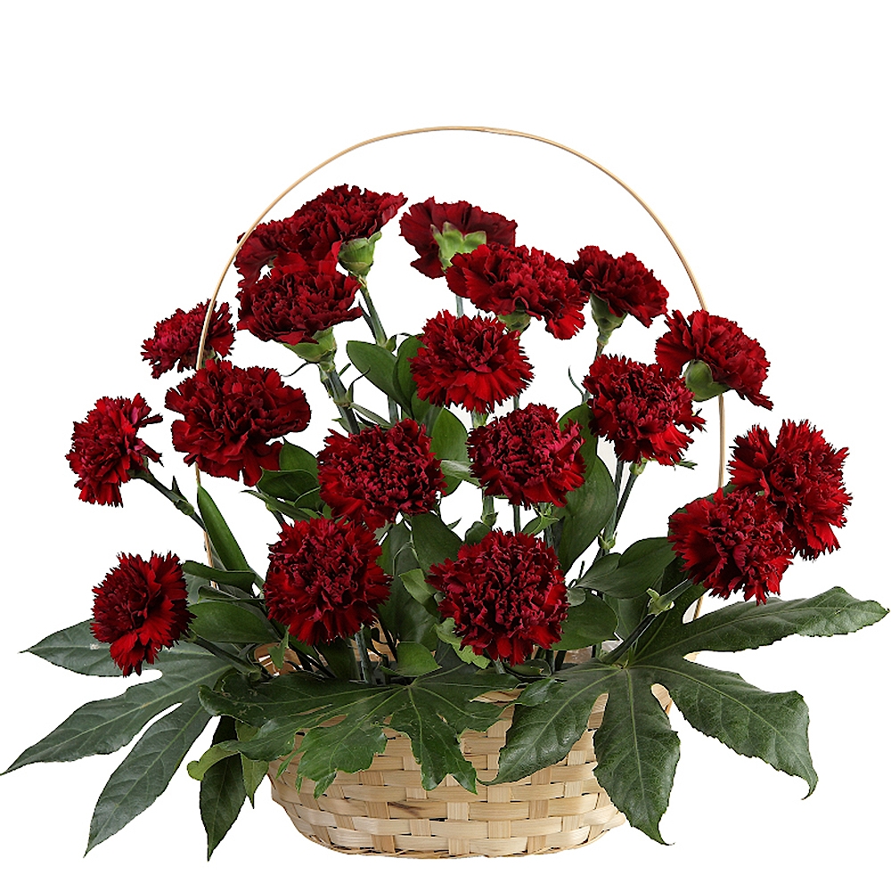 Este hermoso ramo está compuesto por claveles, ruscus y fatsia. Los claveles le dan al ramo un tono alegre con sus colores brillantes. Las hojas verdes de ruscus y fatsia complementan perfectamente las flores y les dan una textura interesante. El ramo se presenta en una gran cesta, lo que le da un aspecto rústico y natural. En el fondo de la cesta hay espuma floral, que sujeta firmemente las flores y mantiene su frescura. Este ramo de flores es perfecto para cualquier ocasión y seguramente alegrará el corazón de los destinatarios.