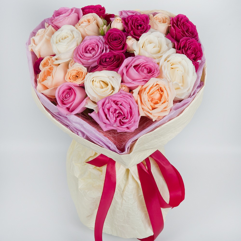 Este magnífico ramo está compuesto por tres rosas arbustivas. La primera rosa es de un delicado color rosa, y mide 50 centímetros de largo. Sus pétalos están teñidos de un suave tono rosa, lo que le da al ramo un carácter romántico. La segunda rosa es deslumbrantemente blanca, y su tamaño también es de 50 centímetros. Simboliza la pureza y la nobleza, creando un contraste llamativo con la rosa rosa. La tercera rosa tiene un tono crema y la misma longitud. Sus pétalos suaves tienen un color cálido y suave, lo que le da al ramo una atmósfera cálida y acogedora.